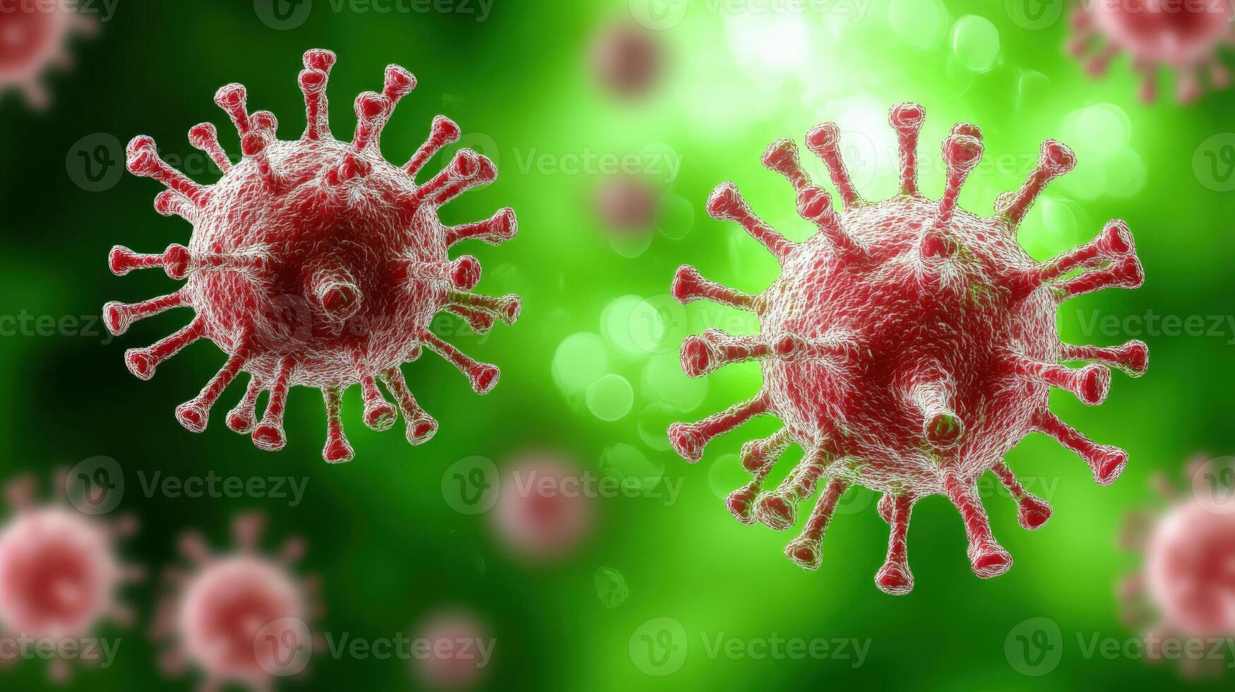Microscopic view of bacteria and viruses floating in green background, showcasing their intricate structures and details. This highlights complexity of microorganisms Pro Photo
