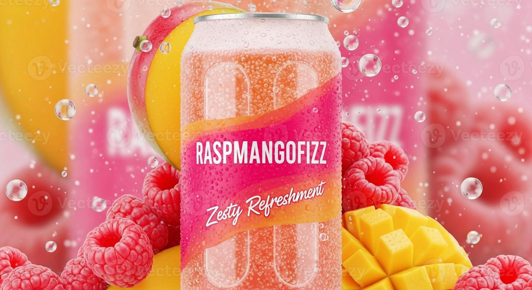 A can of raspberry raspberry mango drink with raspberries Pro Photo