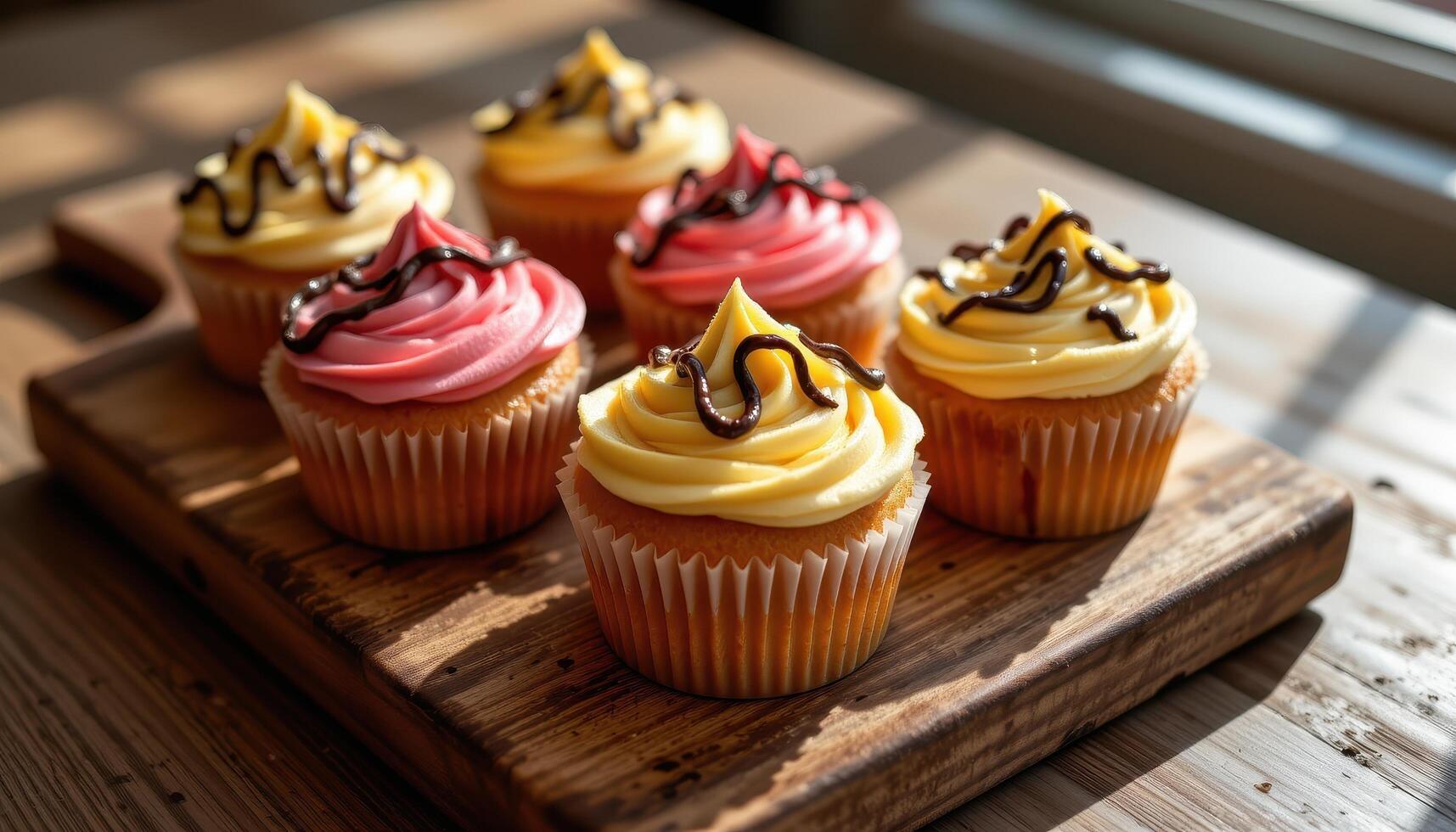 a tray of cupcakes with bright frosting patterns and chocolate drizzle on a rustic wooden board, sunlight illuminating textures, no humans around. Free Photo