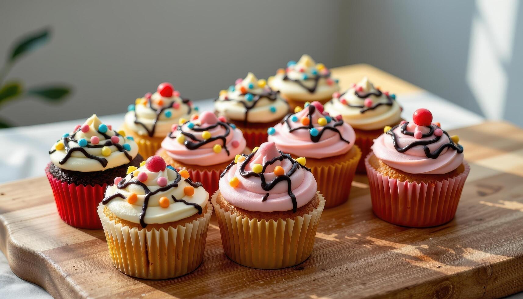 festive cupcakes with chocolate drizzle and bright frosting patterns arranged on a wooden surface, sunlight softly streaming, no humans visible. photo