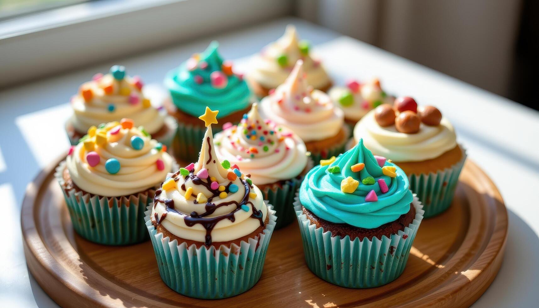 festive cupcakes with chocolate drizzle and bright frosting patterns arranged on a wooden platter, sunlight softly highlighting textures, no humans. photo