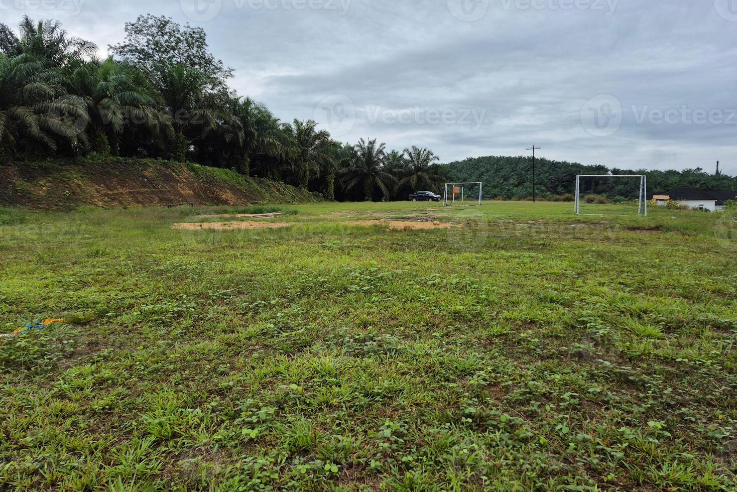 A wide stretch of open land with patches of green grass under a calm, partly cloudy sky, bordered Pro Photo