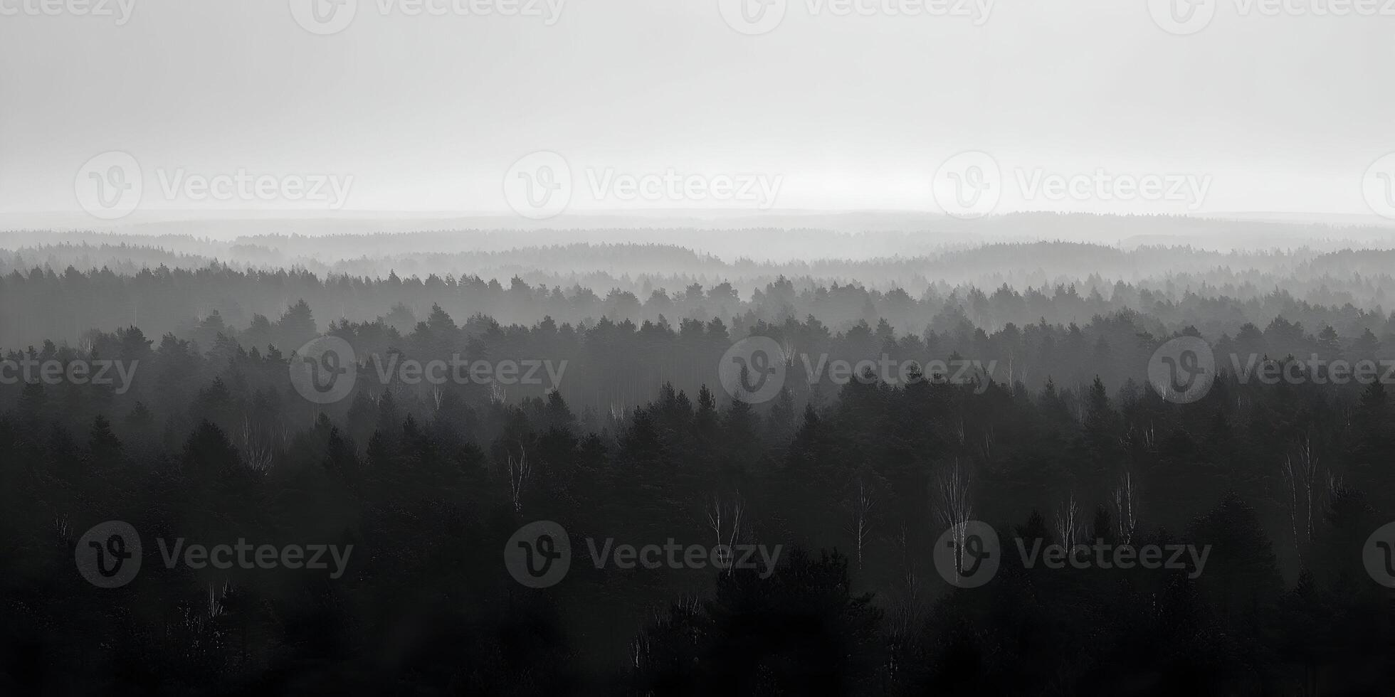 Dense layers of evergreen trees recede into a mysterious foggy background creating a moody grayscale forest landscape Pro Photo