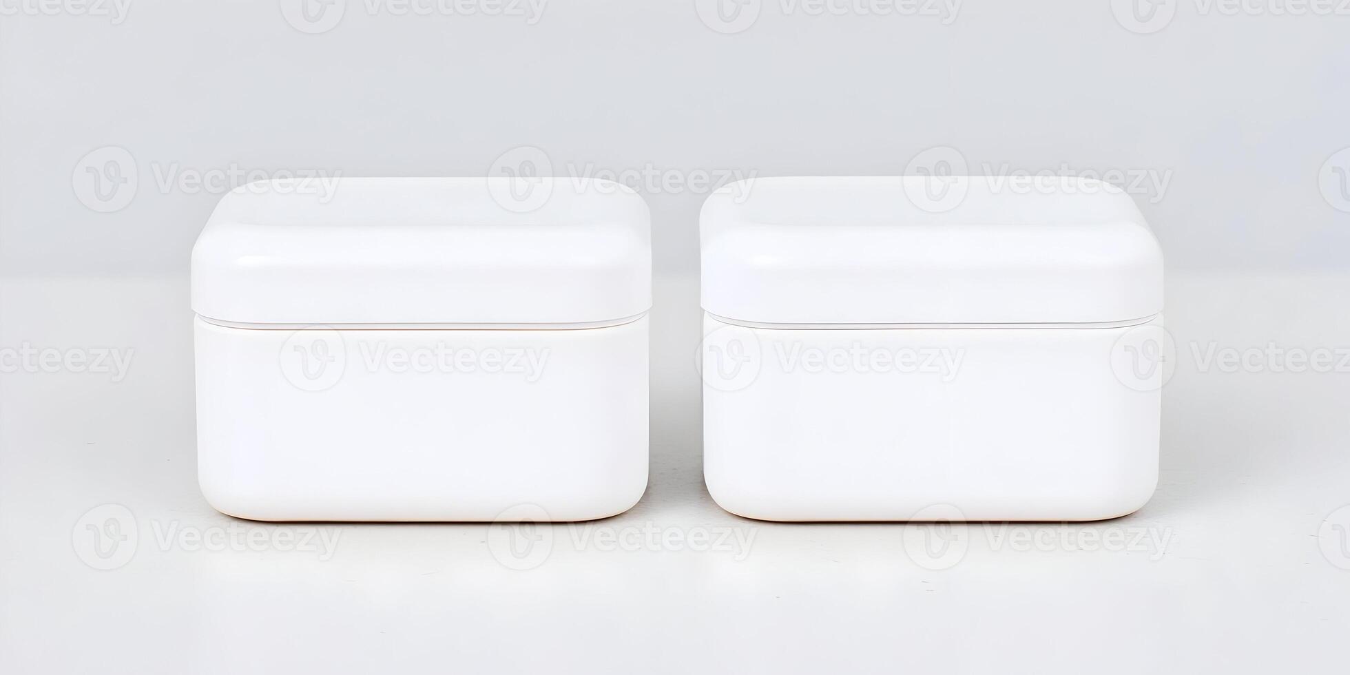 Two identical white square containers with rounded corners are displayed on a light gray surface against a plain background Pro Photo