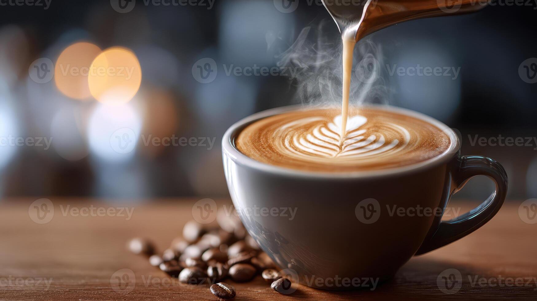 Steaming cup of coffee with intricate latte art on a wooden table, surrounded by scattered coffee beans. Cream is being poured from a small pitcher, creating ripples in the foam Pro Photo