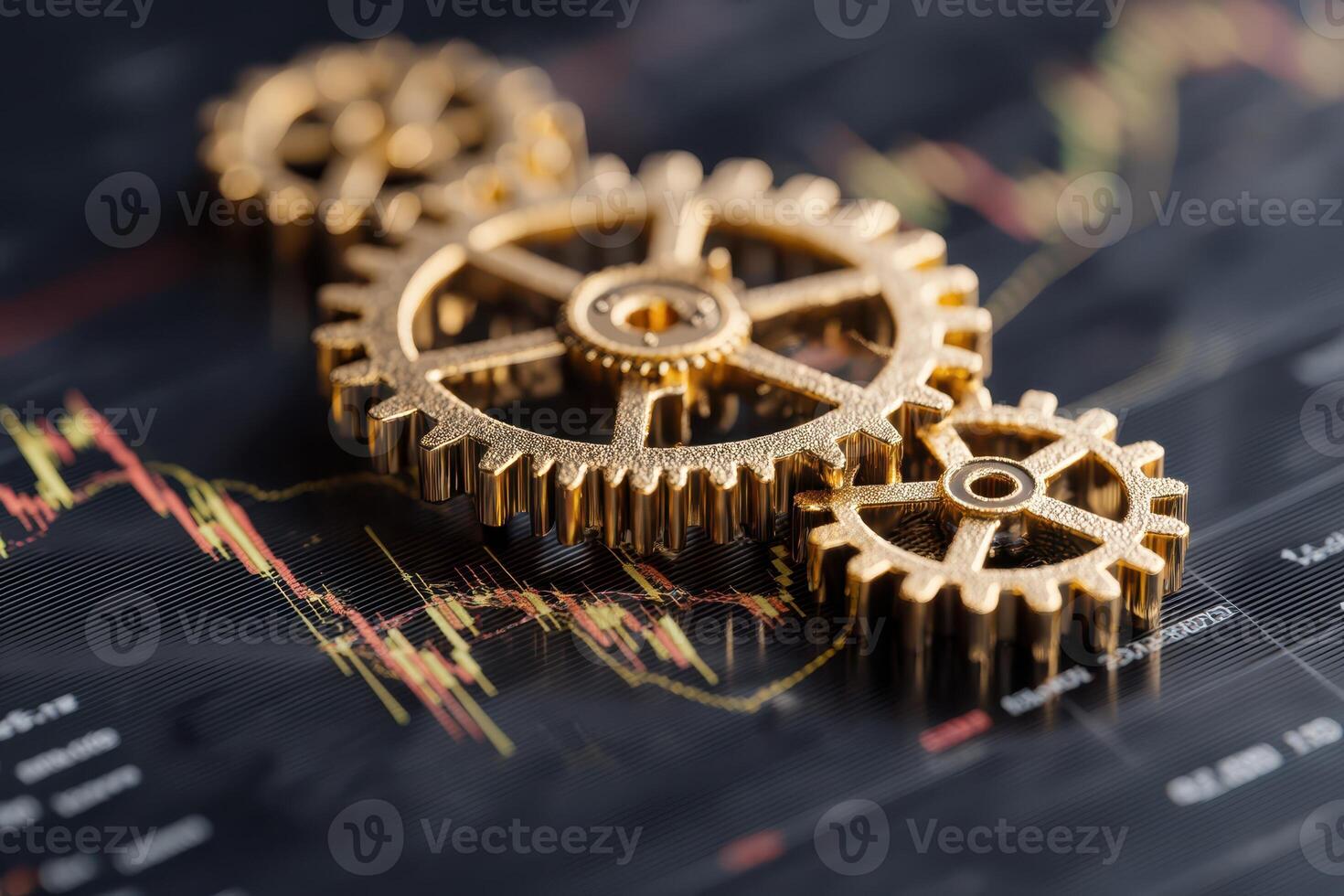 Golden gears interlock on a financial chart background with fluctuating lines and data points, symbolizing the interplay between mechanics and financial markets, suggesting industry synergy Pro Photo