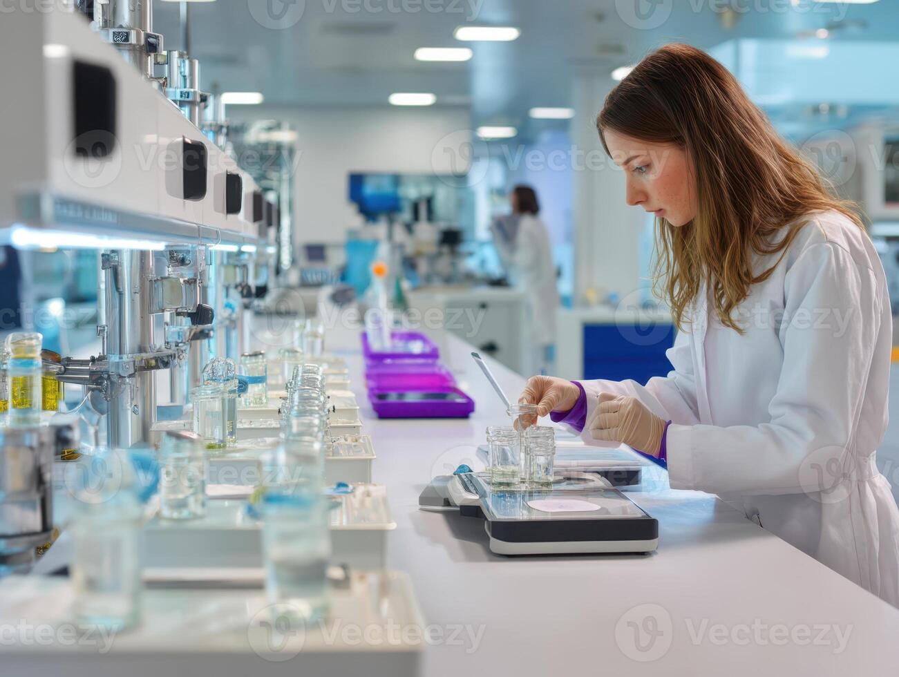 Scientist wearing lab coat works with liquid samples on analytical balance in a brightly lit laboratory setting, surrounded by bottles and equipment, focused on precise measurements Pro Photo