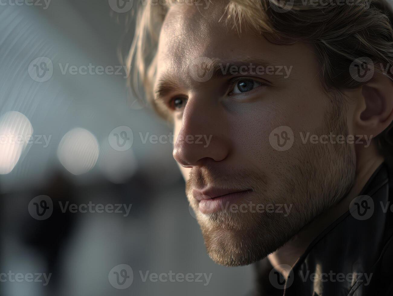 Young man with light hair and beard looks pensively to the side in a softly lit setting with defocused lights in the background, adding depth and warmth to the portrait Pro Photo