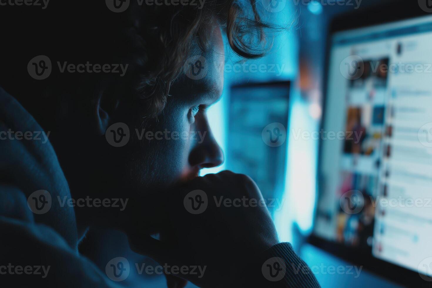 Young person with curly hair focuses intently on a computer screen, illuminated by its soft blue light. The monitor displays various images, suggesting social media browsing Pro Photo