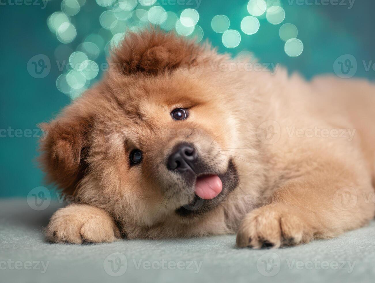 Fluffy, golden-coated puppy with a playful expression lies on a soft surface, tongue out. Its ears are perked, and the background features a soft bokeh with circular light effects Pro Photo