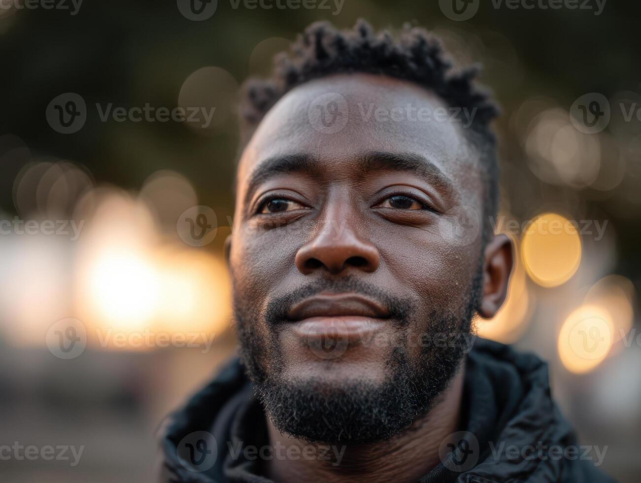 Smiling person with beard looking into distance, wearing dark jacket. Background has blurred lights creating a bokeh effect, hinting at an outdoor setting during sunset Pro Photo