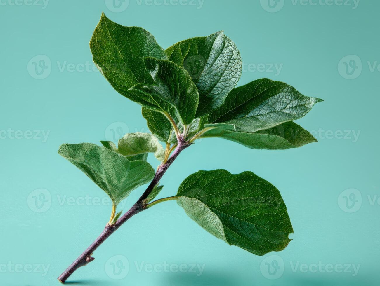 Branch with green leaves displaying different textures and shades, against plain background. Each leaf vein is visible, showing intricate patterns the stem is thin and slightly curved Pro Photo