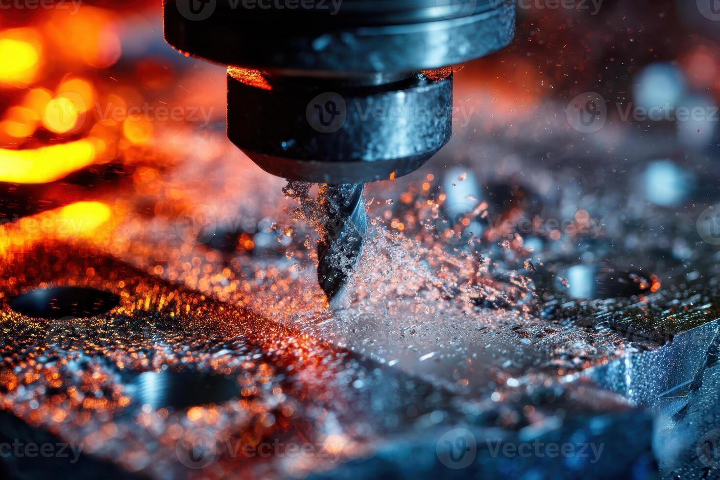 Close-up of a CNC machine drilling into a metal surface, with sparks flying. The drill bit creates dynamic motion, showcasing the intensity and precision of industrial machinery Pro Photo