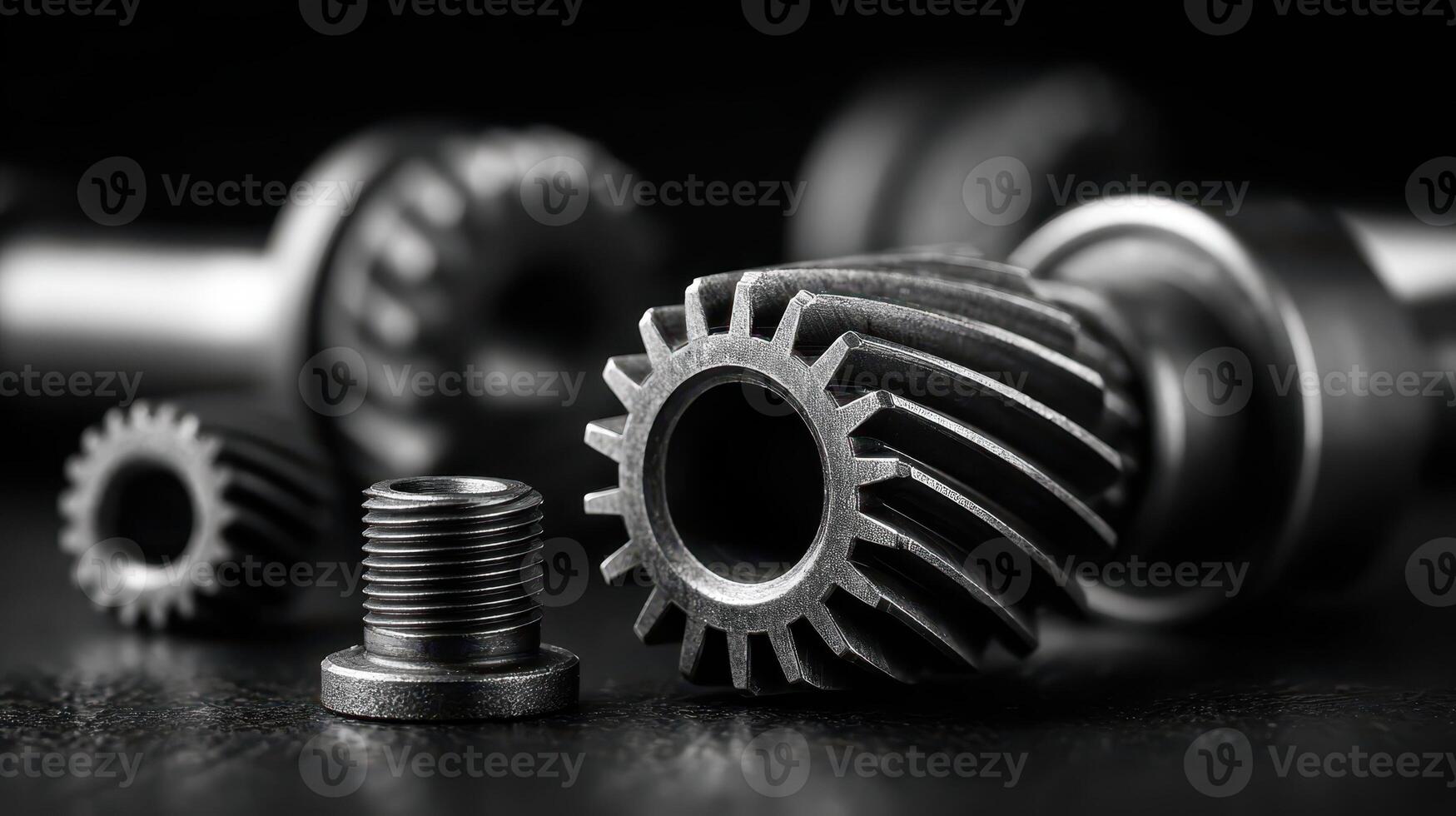Metal gears with intricate teeth patterns in a close-up, monochrome photograph showcasing precision engineering. The focus is on the front gear with others blurred in the background Pro Photo
