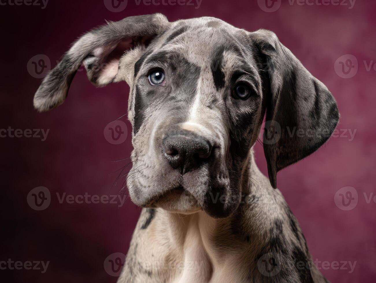 Young spotted dog with droopy ears and expressive blue eyes against a blurred red backdrop. The dog's fur features a striking mix of greys and blacks, creating a unique marbled pattern Pro Photo