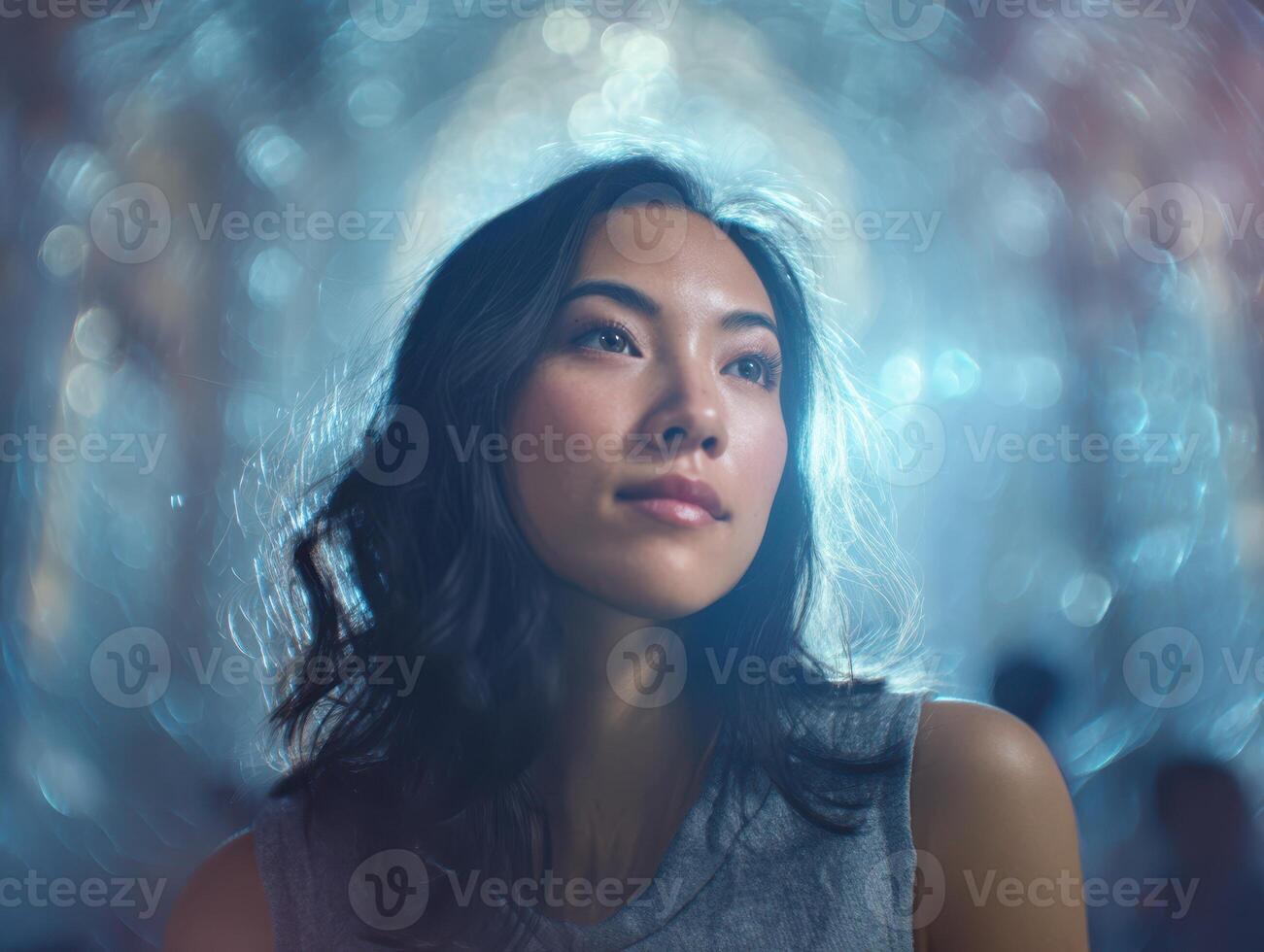 A woman with long dark hair gazes upward with a soft expression, surrounded by a dreamy bokeh effect, creating an ethereal atmosphere. Light glimmers create a halo-like effect Pro Photo
