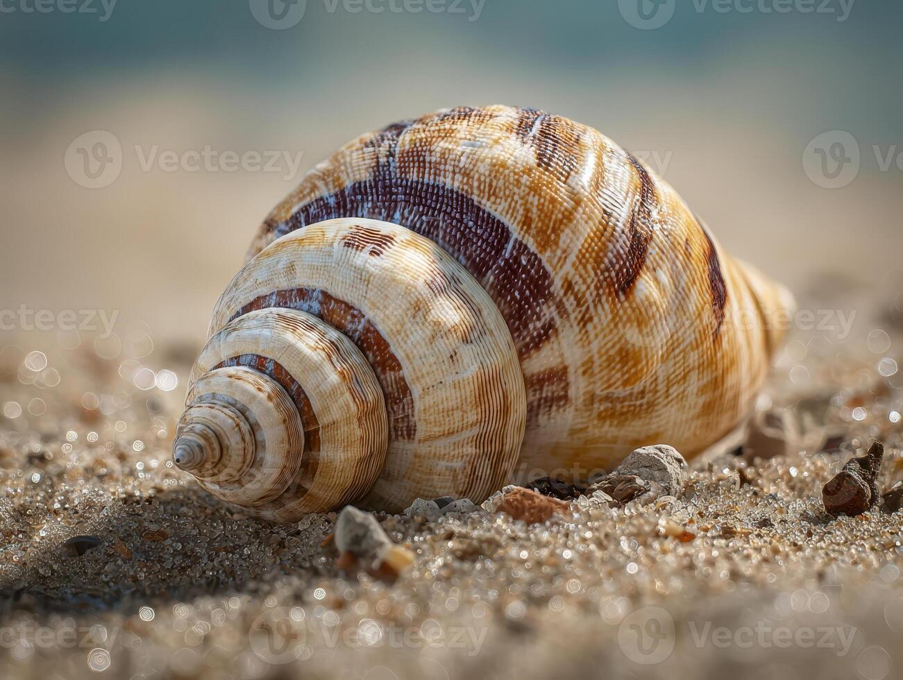 A close-up of a spiral seashell resting on sandy beach, detailed with brown, white patterns, surrounded by tiny grains and small pebbles in soft focus, capturing natural textures vividly Pro Photo