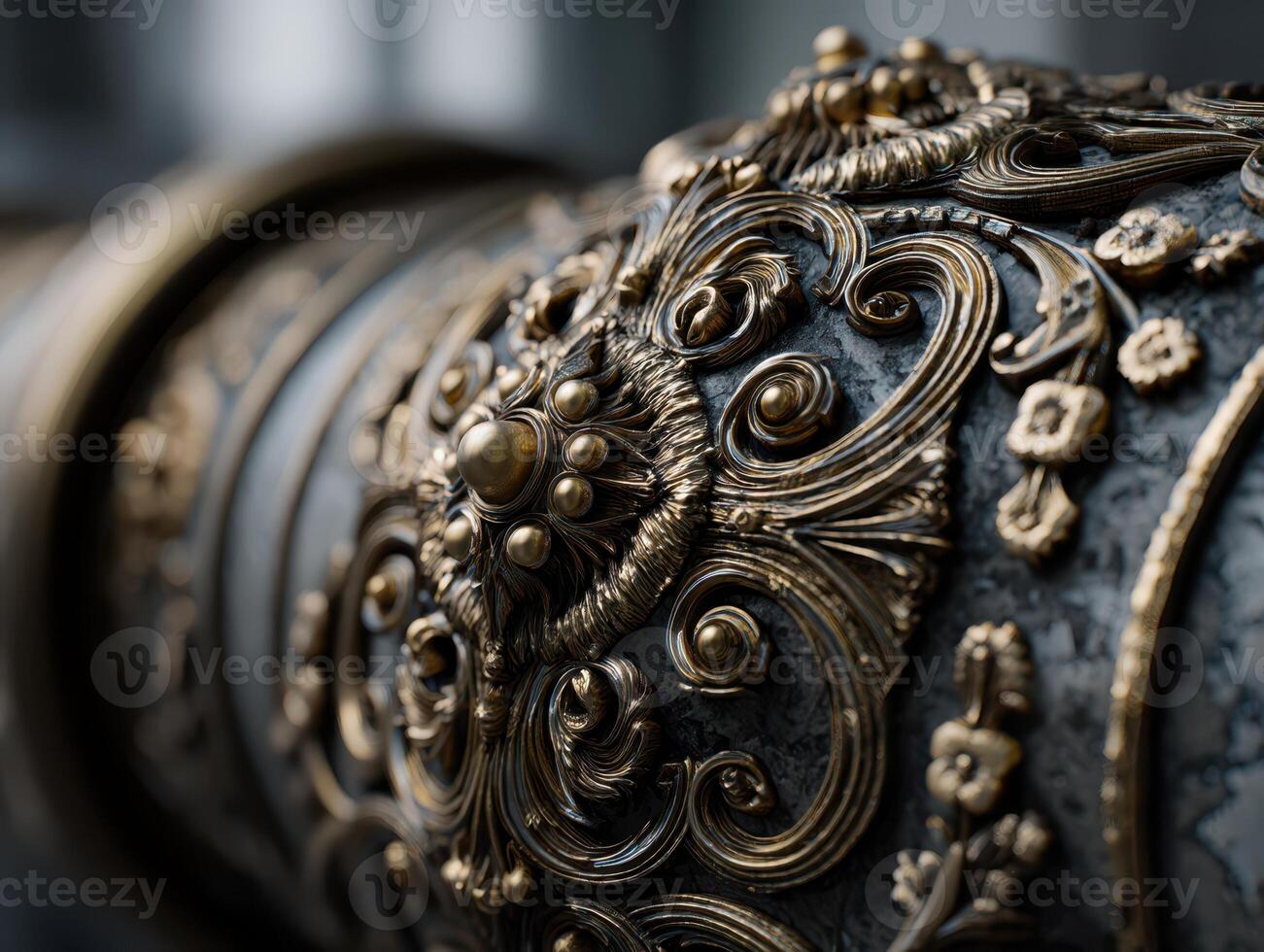 Intricate, detailed close-up of metallic, ornamental carvings with swirling patterns and floral motifs on a cylindrical object. The texture highlights the interplay of shadow and light Pro Photo