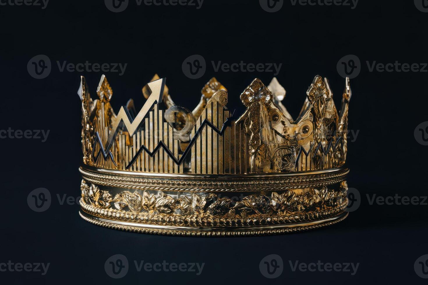 Golden ornate crown with intricate patterns, featuring pointed tips and detailed engravings. The crown displays a combination of smooth and textured surfaces, creating a regal and majestic appearance Pro Photo