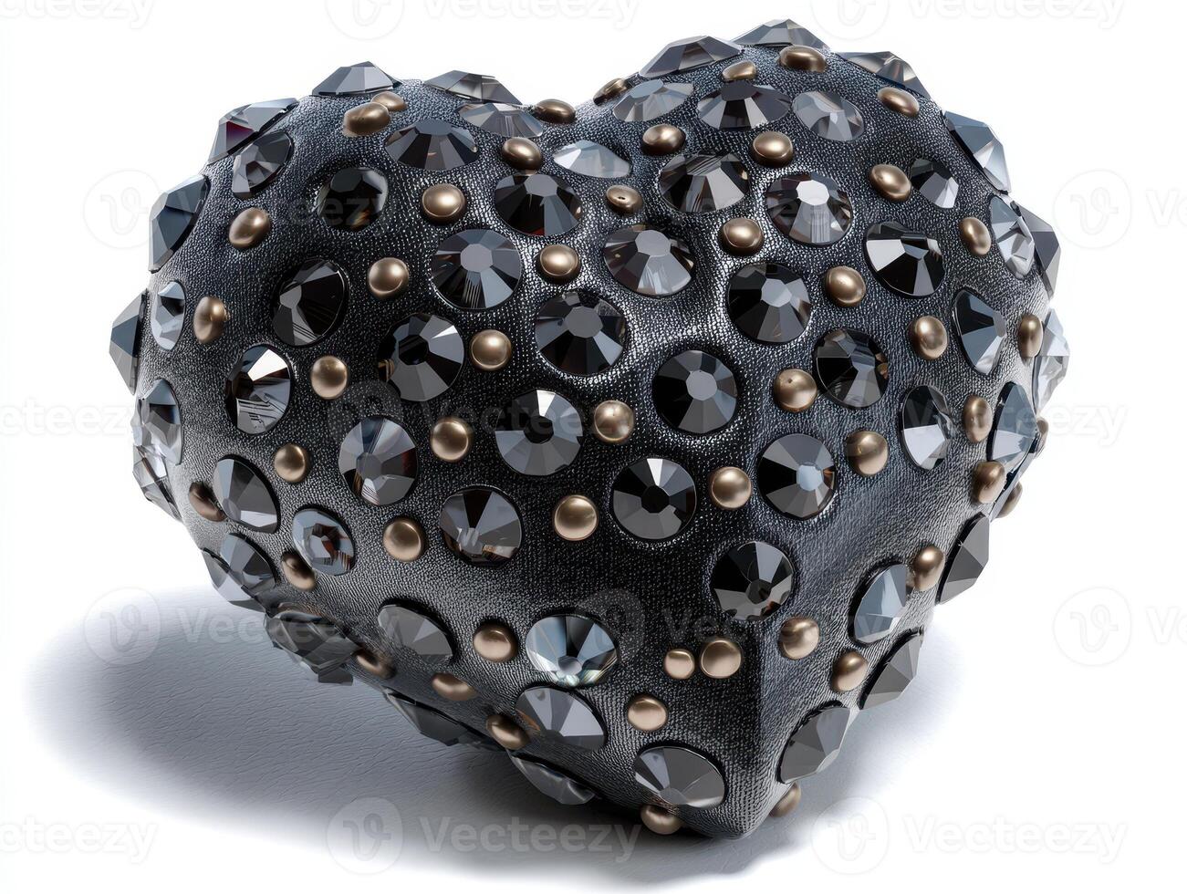 Heart-shaped object adorned with black and metallic studs, featuring various sizes of faceted gems creating a textured, luxurious appearance. The design is striking and modern Pro Photo