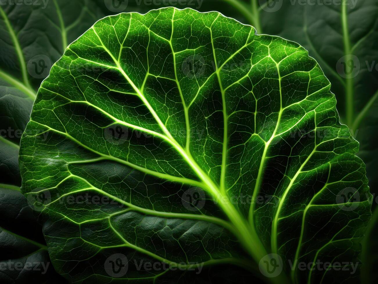Vibrant close-up of a veiny green leaf, showcasing intricate patterns and textures illuminated by light. The details of the leaf's surface create a visually stunning natural display Pro Photo