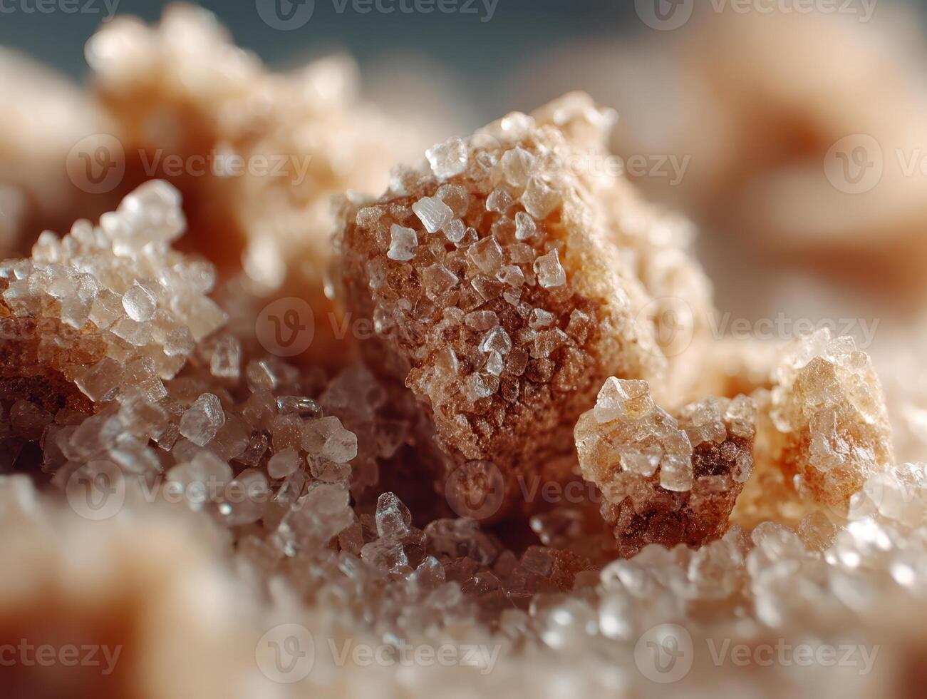 Brown crystalline clusters close-up, displaying intricate textures with a mixture of fine and coarse granules. Focus on the central cluster's detailed surface, highlighting its transparency Pro Photo
