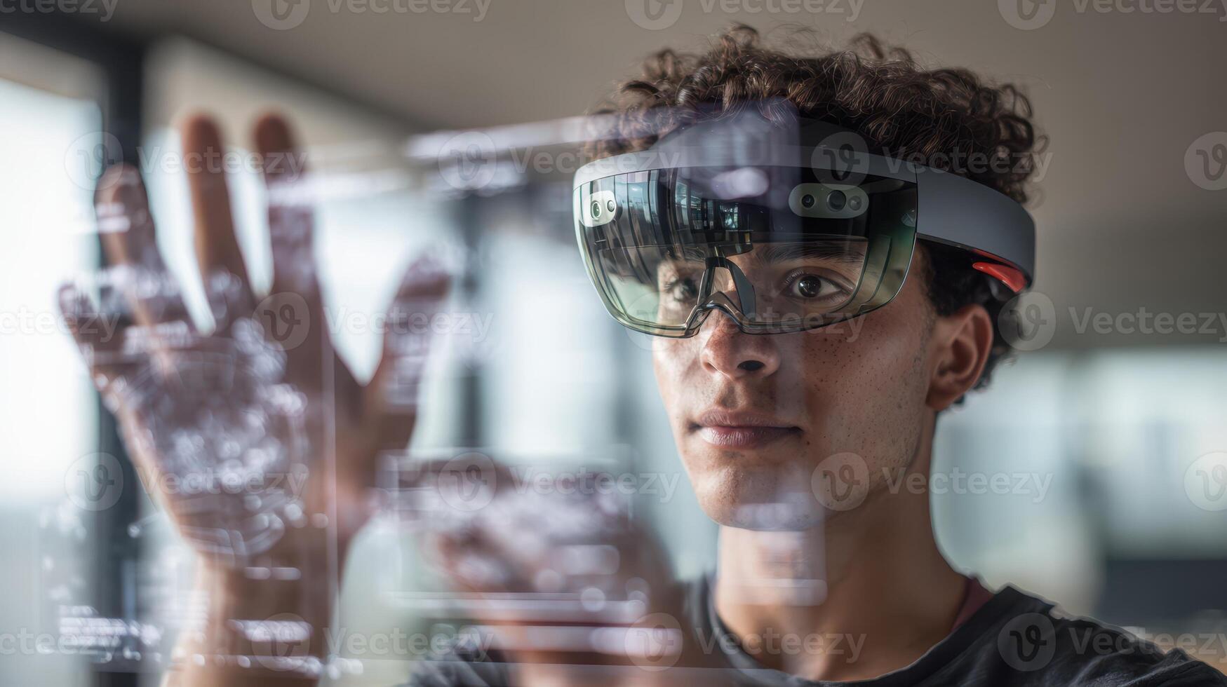 Individual wearing transparent smart glasses interacts with a digital interface, focusing intently on holographic elements floating in the air. Light reflections highlight the tech innovation Pro Photo
