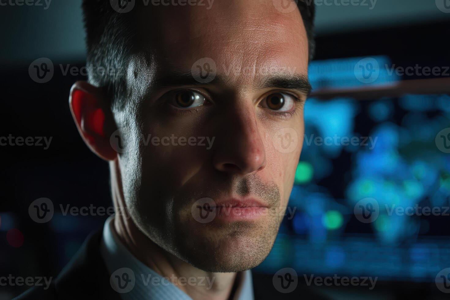 Serious man in focus, facing camera with intense expression, in professional setting. Blurred high-tech screens in background, conveying an environment of technology or control Pro Photo