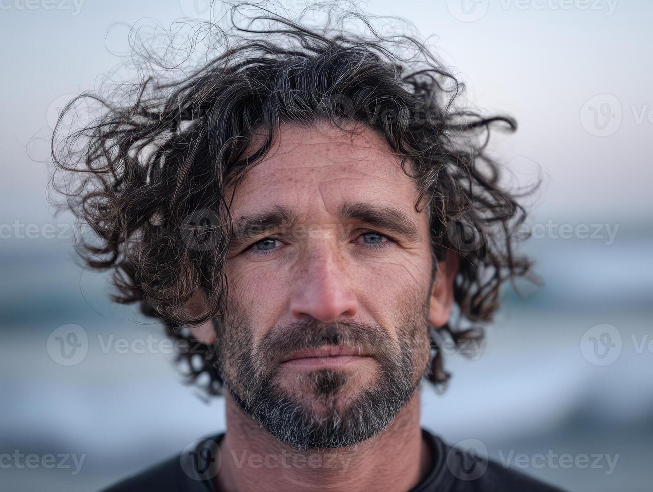 Disheveled curly-haired man with a serious expression looking directly at the camera. He has a beard and wears a plain dark shirt. Background is soft-focus and neutral Pro Photo