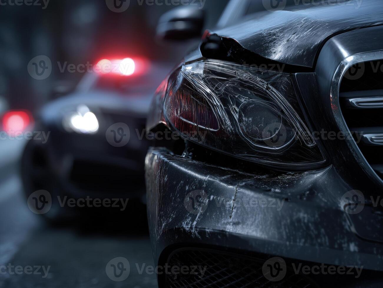 Close-up of a damaged car in dim light, focus on scratched headlight. Another car with red emergency lights is visible in the blurred background, hinting at a collision scene Pro Photo