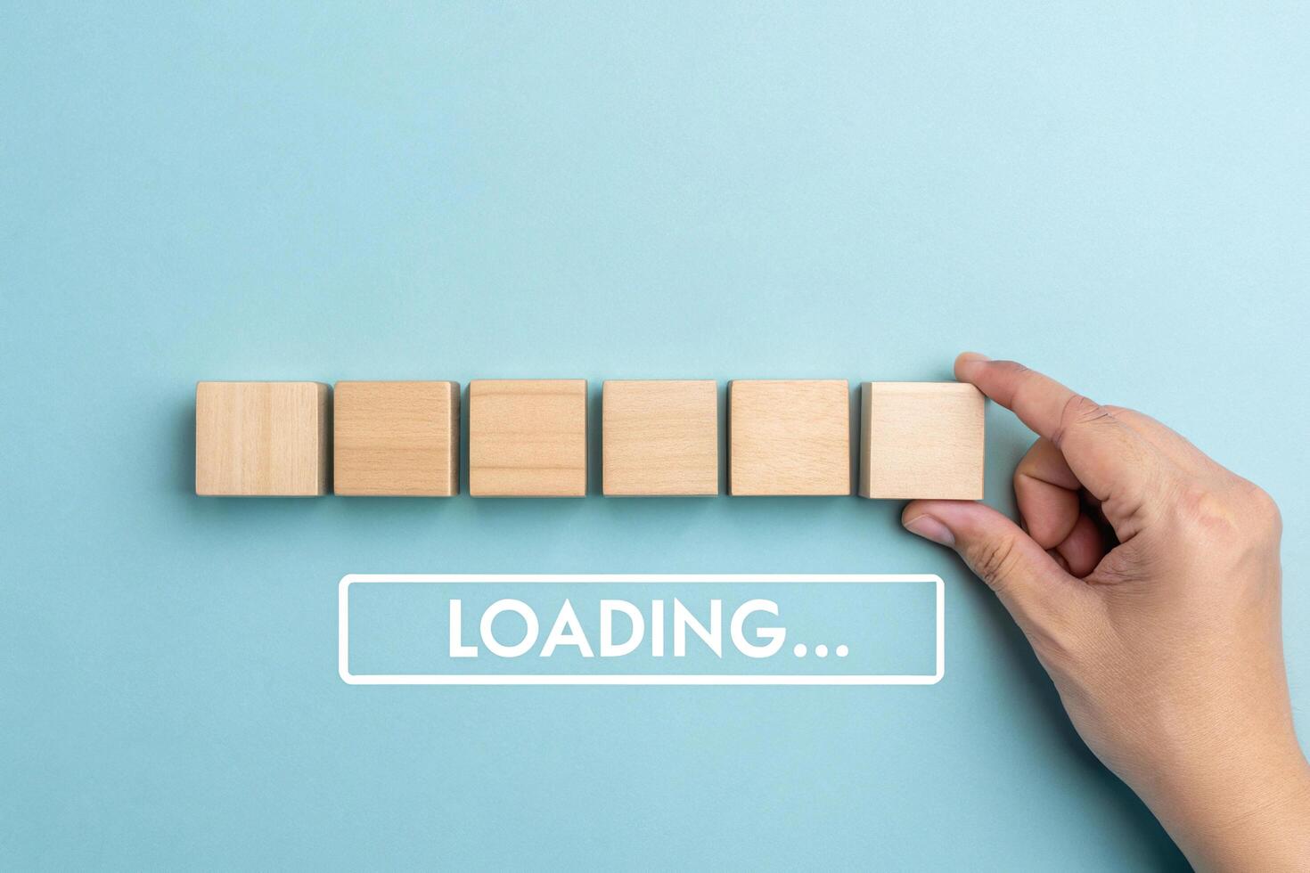 Hand adding last block to loading bar, isolated on blue background Free Photo