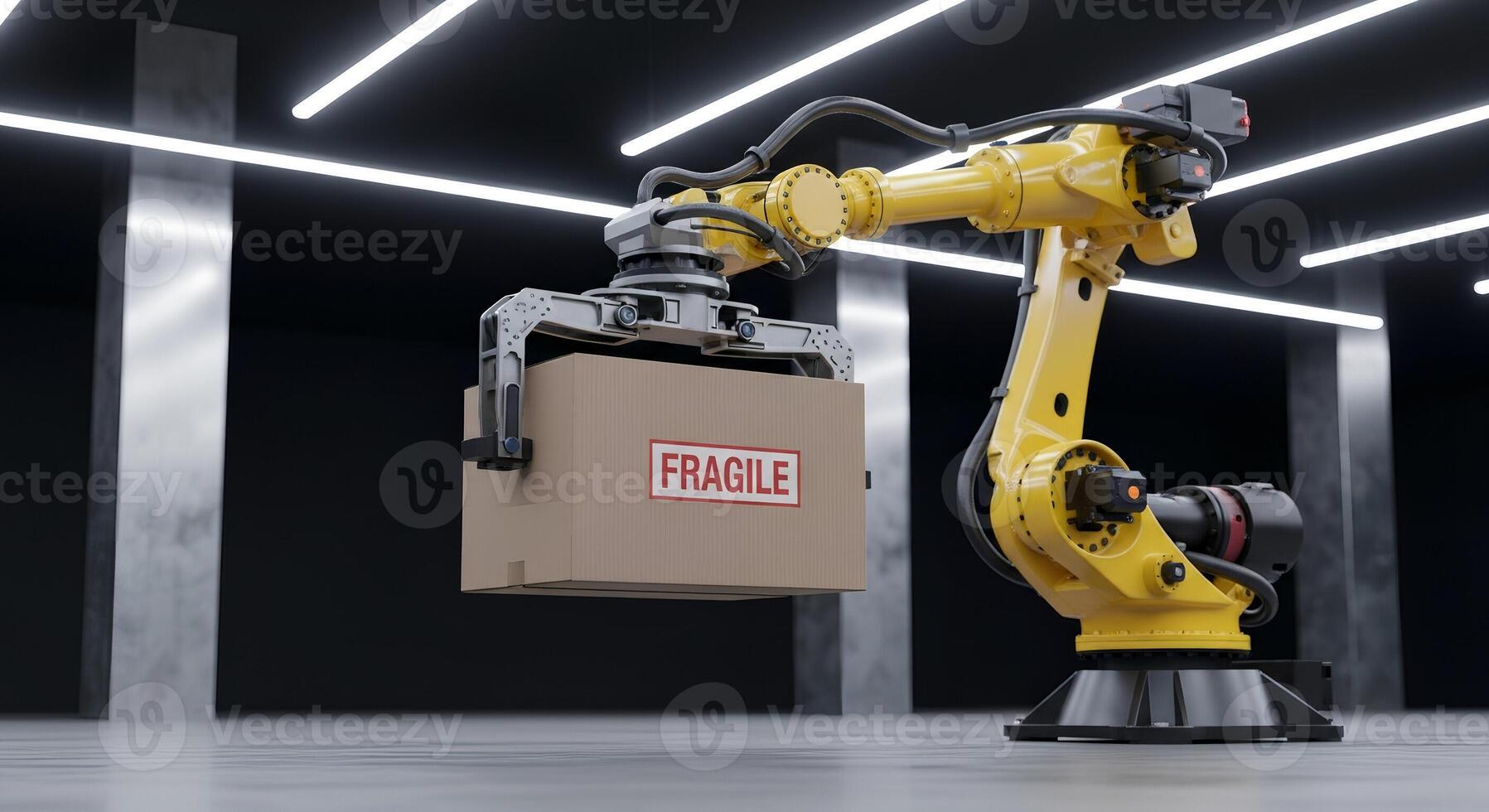 Robotic arm handling a fragile package in a modern warehouse setting. Pro Photo
