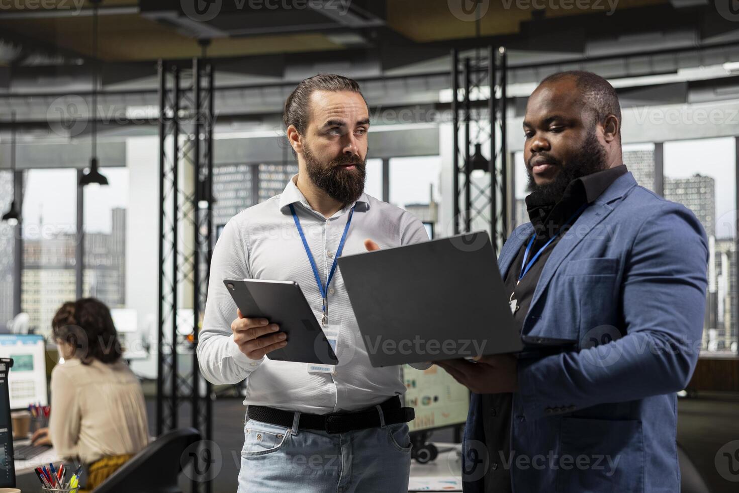 Team of diverse men work with technology and performance metrics, aligning business strategy and project objectives to drive results and success within a multinational company environment. Pro Photo