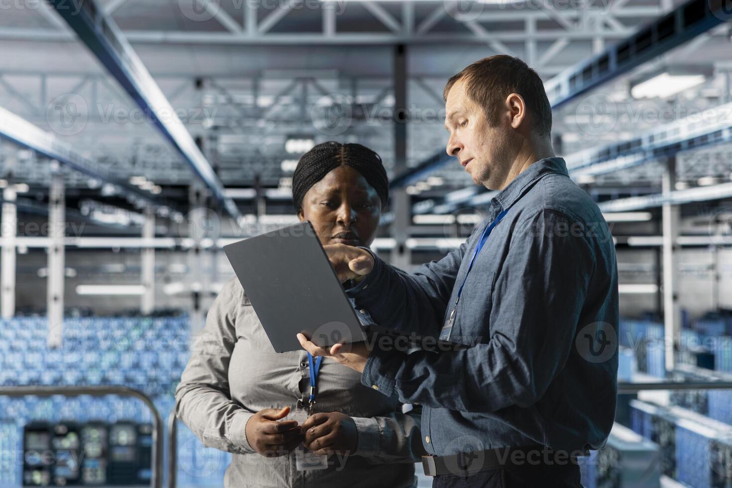 Teamworking data center technicians installing upgraded server racks systems using laptop. Server room coworkers monitoring infrastructure performance using automation tools on notebook Pro Photo