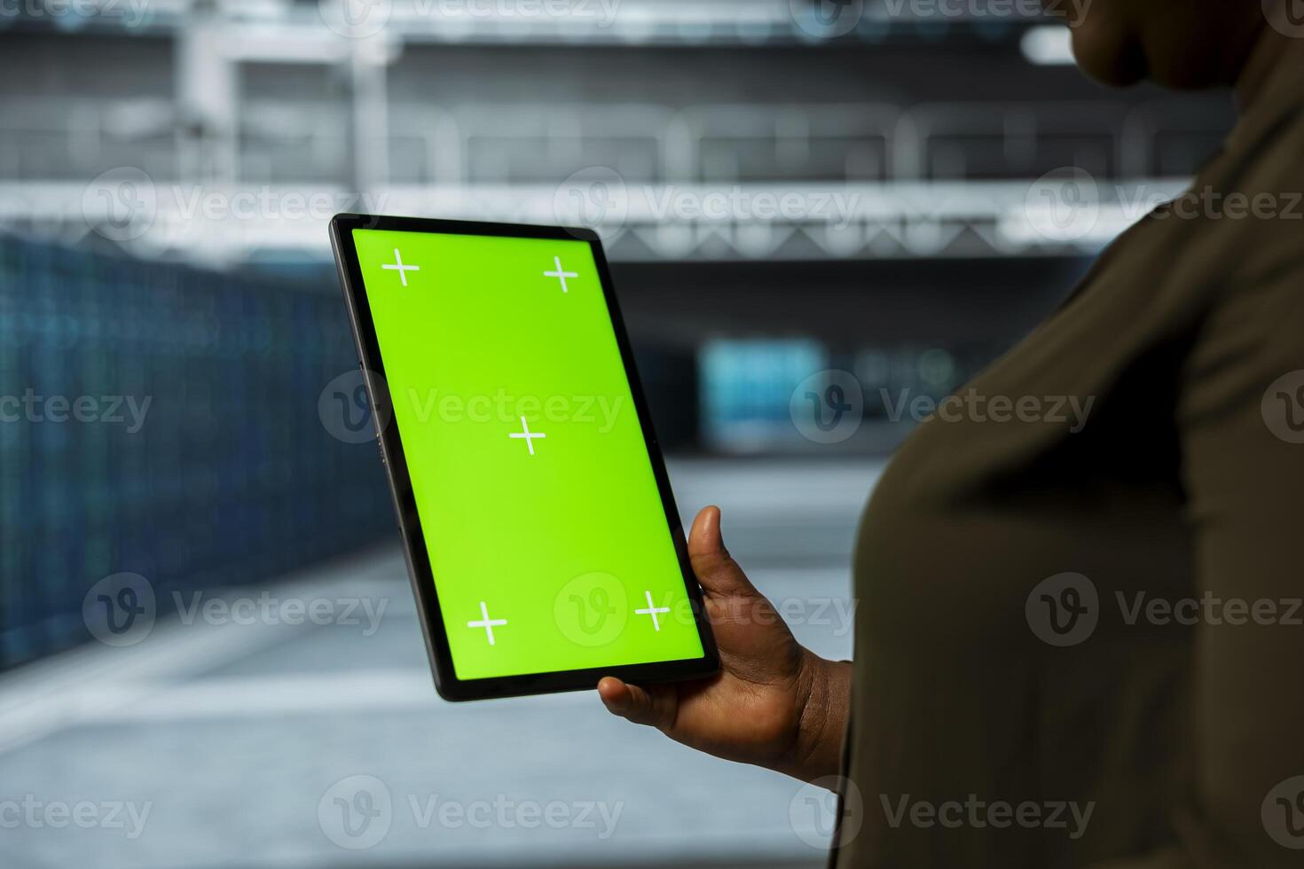 Data center technician using isolated screen tablet to automate anomaly detection. Server farm employee using chroma key device, minimizing downtime through predictive maintenance Pro Photo