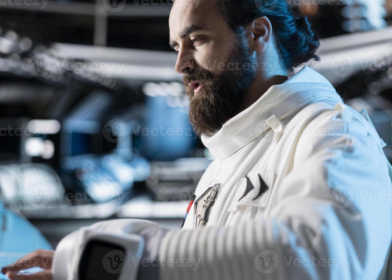 Portrait of astronaut researcher exploring deep space, gathering findings for future analysis. Scientist wearing cosmonaut gear in spaceship making routine research observations, completing tasks Pro Photo