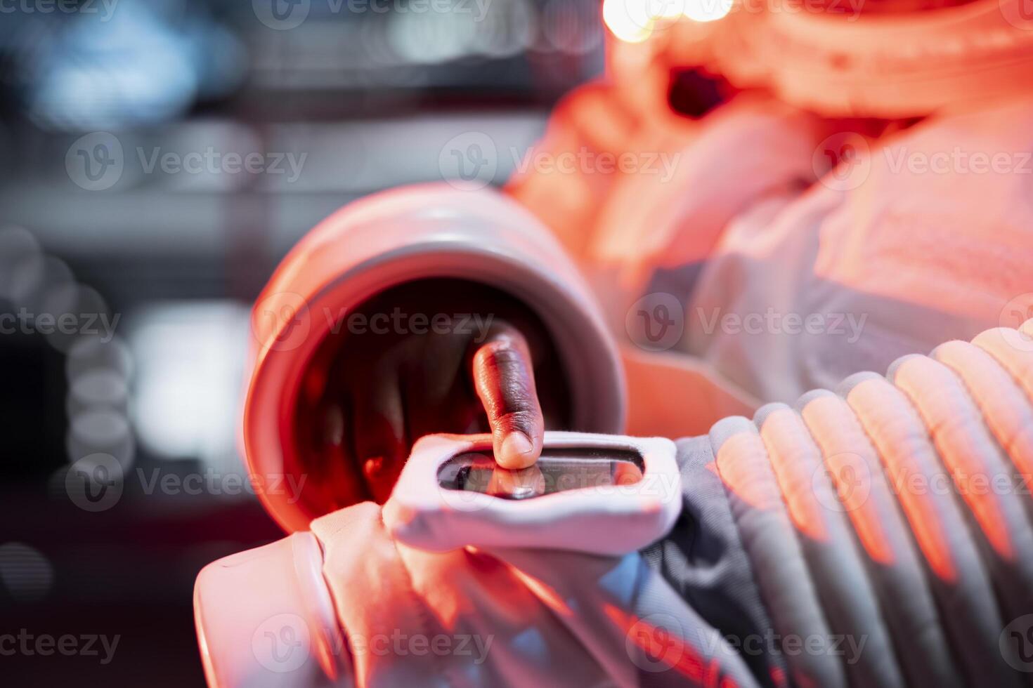 Close up of astronaut pressing wrist device under emergency red lighting to confirm alert and transmit system response. Cosmonaut activates onboard backup systems to manage critical situation Pro Photo