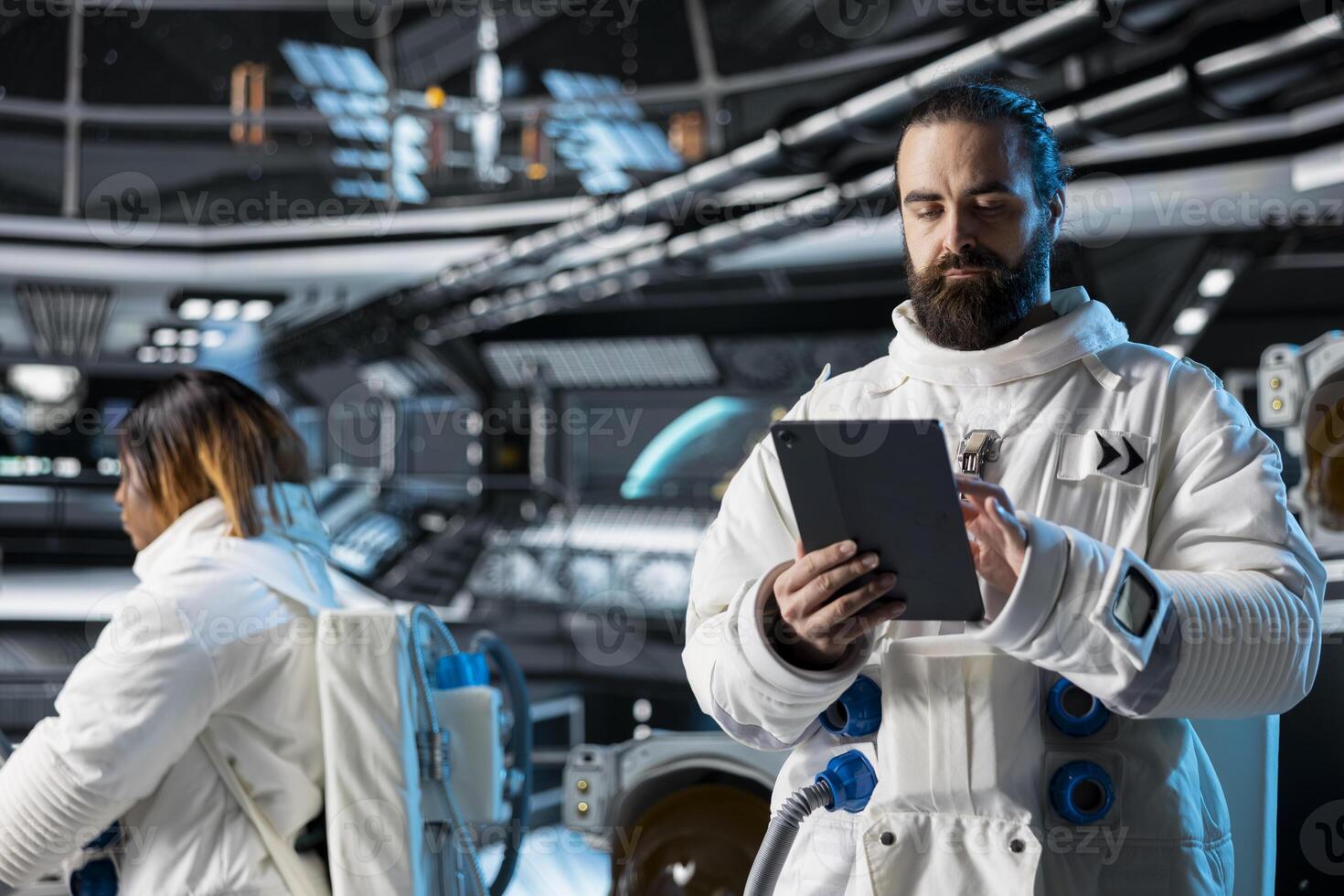 Astronaut doing galaxy observation using tablet during scientific mission in spacecraft. Spaceship crew member in spacesuit monitoring system diagnostics during planetary exploration Pro Photo