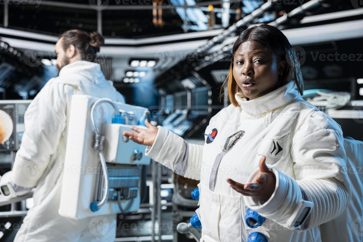 Astronaut doing briefing with Earth based scientists team while orbiting in space station. Starship crew member presents current mission status during remote videocall Pro Photo