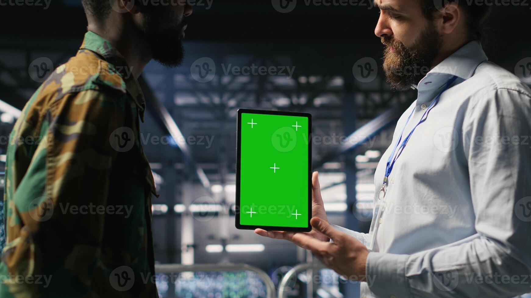 Military personnel overseeing AI computing operations on isolated screen tablet in high tech server facility. Army tech experts using chroma key device to oversee communication systems Pro Photo
