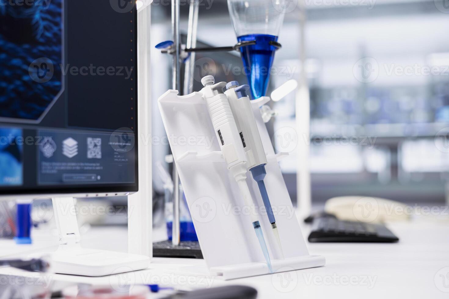 Close up of pipettes placed on holder at laboratory workstation next to PC monitor. Precision instruments used in experiment tests sample preparation doing liquid handling in research facility Pro Photo