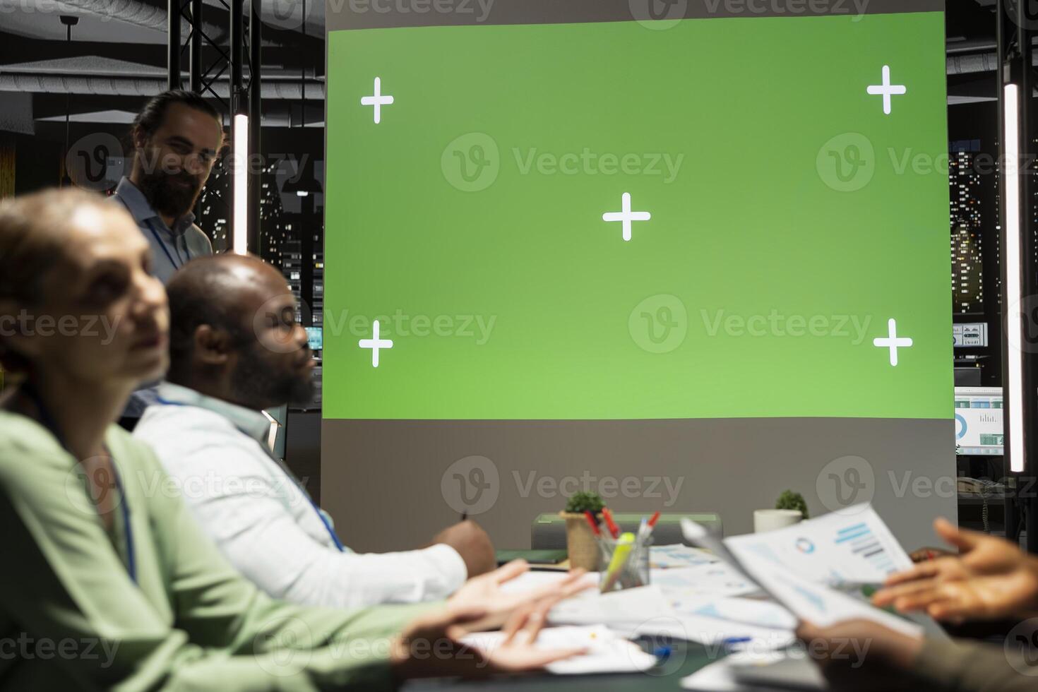 Multiethnic project team works late with copy space display in a multinational company office, reviewing forecasts data and performance metrics on reports. Targets and proposals for success. Pro Photo