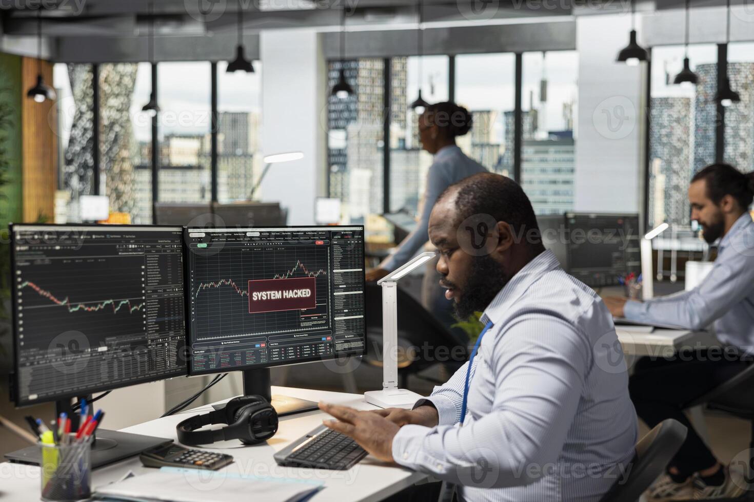 Prop firm trader seeing warning popup of hacking activity, working to secure account. African american man reacting to stock market account perpetrated by hackers looking to gain trade secrets Pro Photo