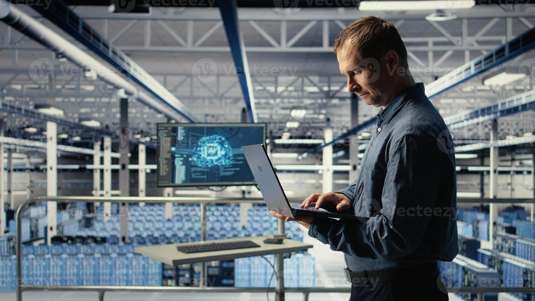 Technician monitors server room activity using laptop while walking through facility. Data center IT professional reviews rigs tests results to ensure systems are working correctly, camera A Pro Photo