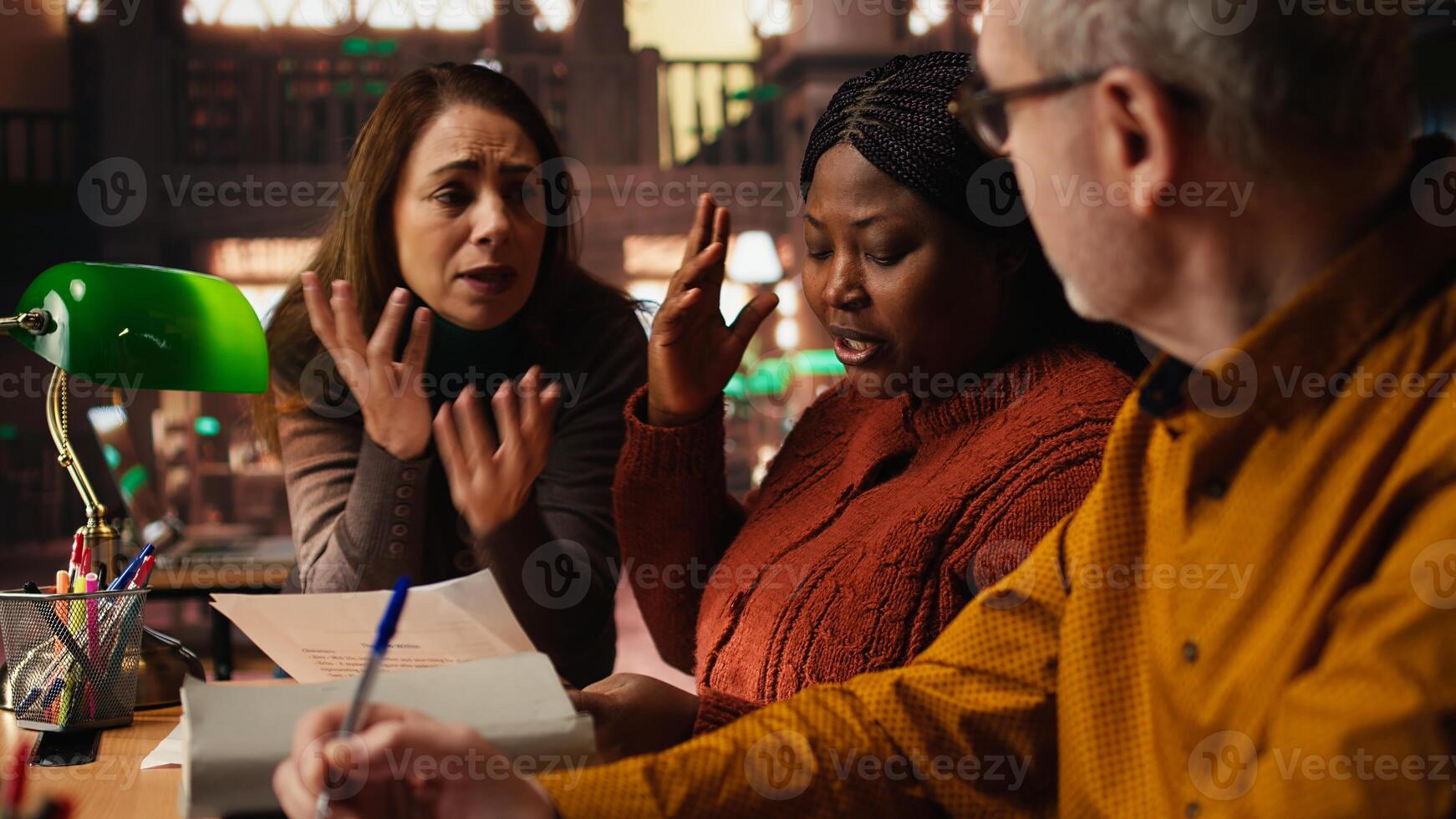 Diverse actors rehearsing dialogue and character expression in a quiet library, studying classic drama play lines with discipline and commitment. Theatre performance practice. Pro Photo