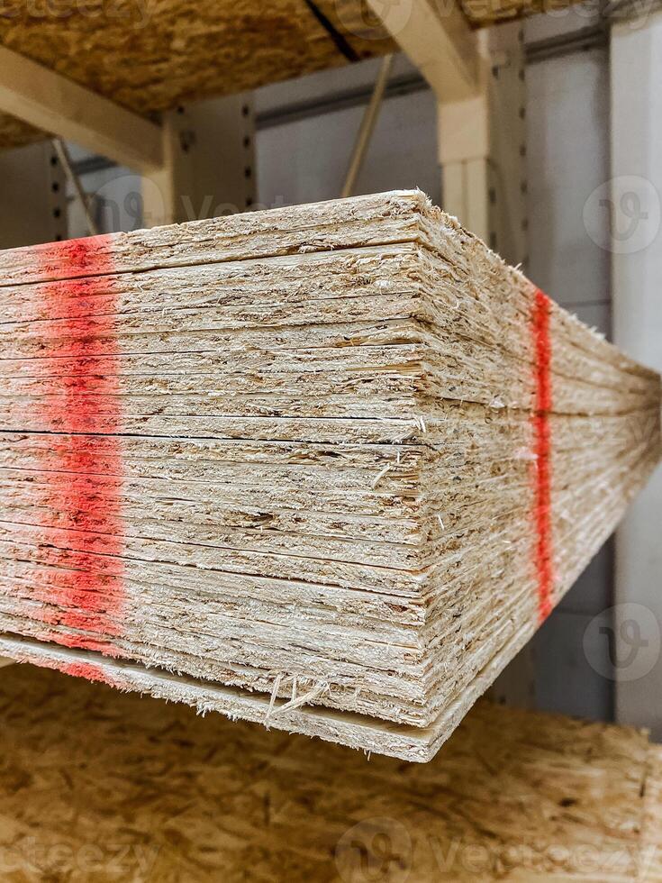 A large stack of plywood sheets is suspended from a sturdy rack in a spacious warehouse, ready for use in various construction projects and woodworking tasks within the facility Pro Photo