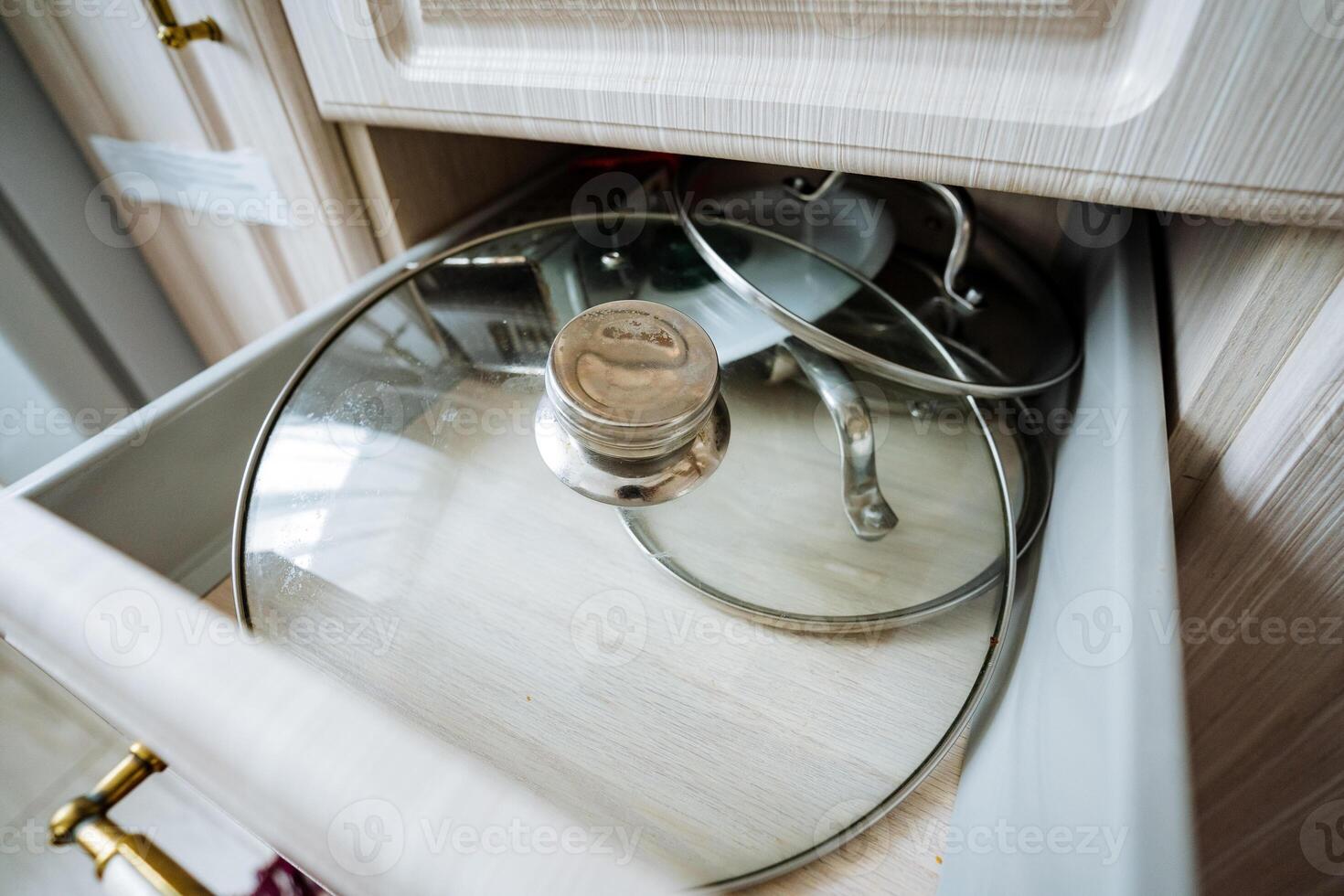 Optimize your kitchen storage solutions by neatly organizing glass lids within a drawer, ensuring a tidy, functional, and efficient cooking space for all your culinary activities and experiences Pro Photo