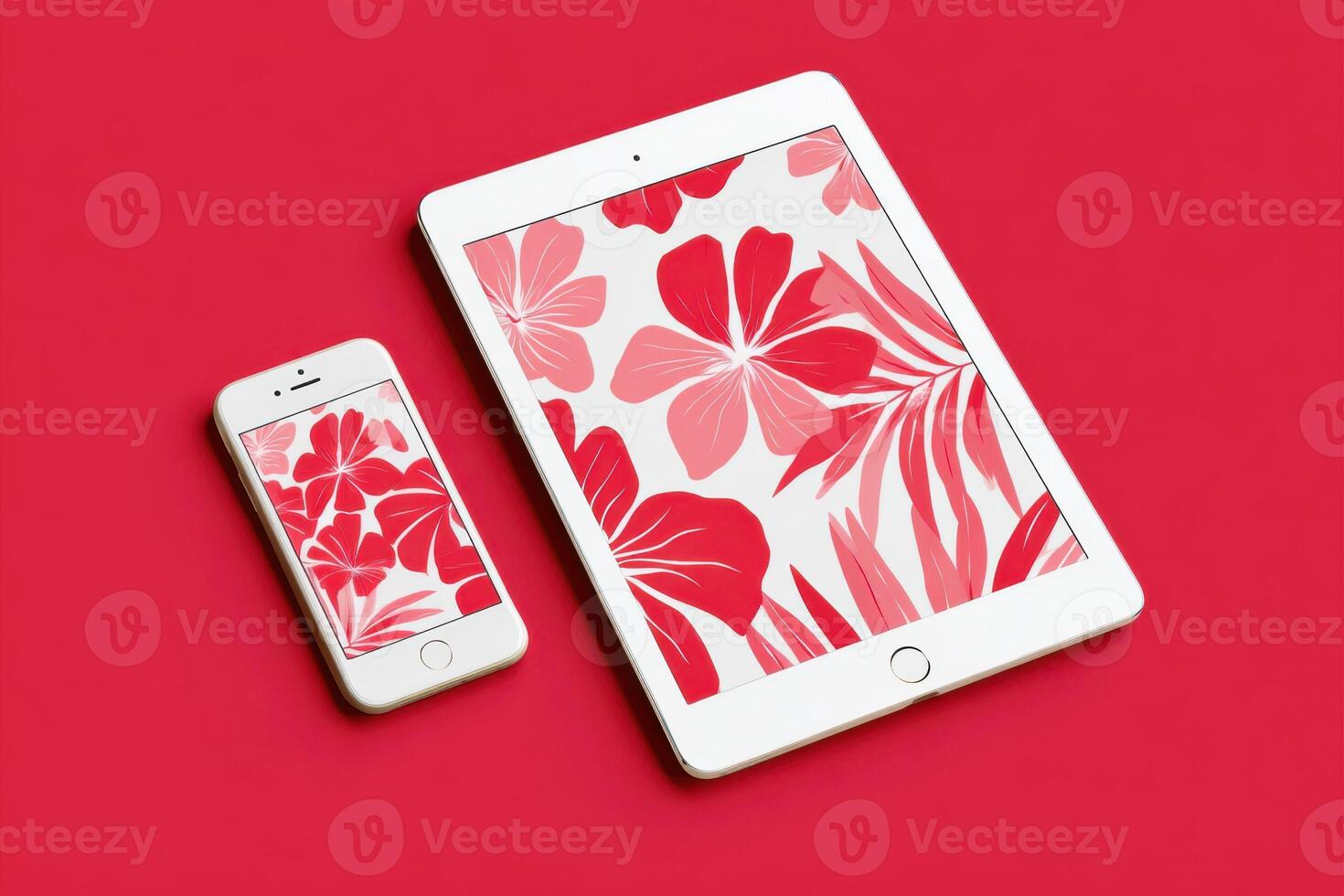 Creative mockup featuring mobile phone and tablet displaying vibrant floral designs on a bold red background, ideal for showcasing digital art and design concepts with copy space Pro Photo