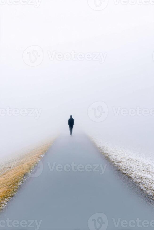 Lone figure walking through heavy fog on a deserted path, surrounded by soft textures of mist and muted colors, creating a sense of solitude and introspection Pro Photo