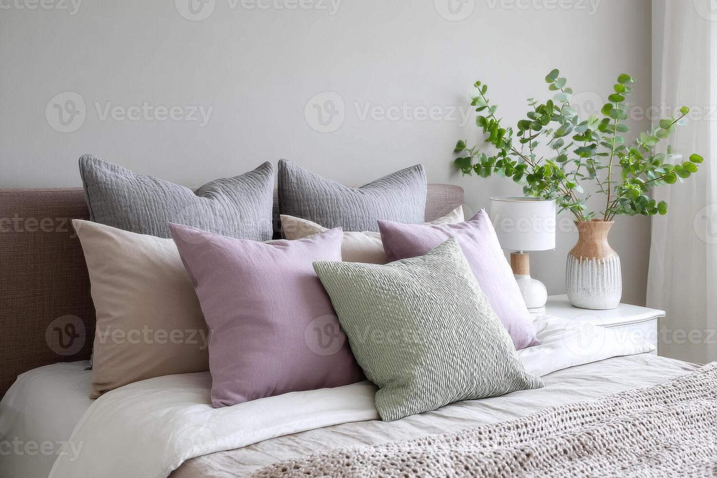 Minimalist bedroom design featuring soft pillows in various shades, complemented by a stylish lamp and greenery, creating a serene and inviting atmosphere with copy space Pro Photo